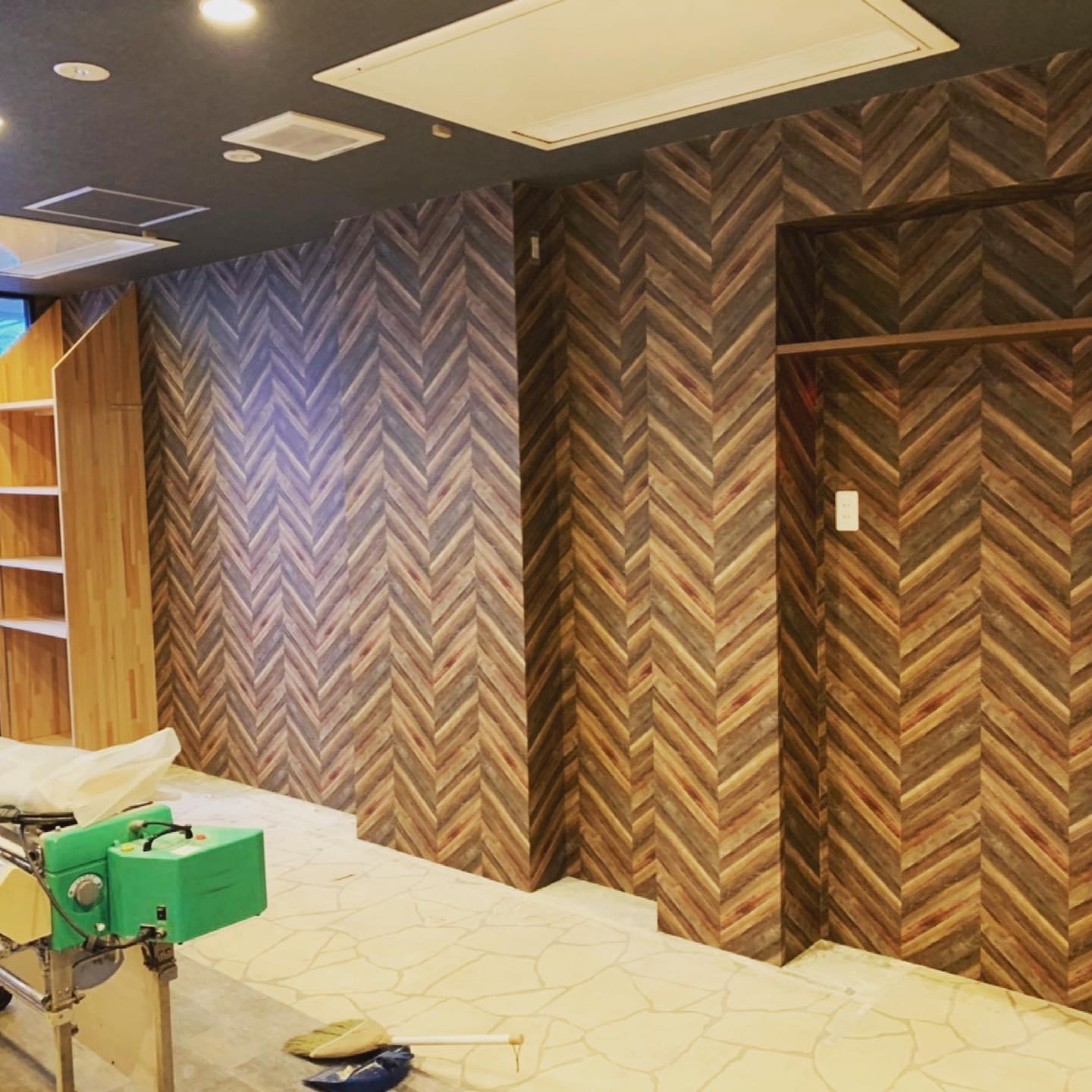 某イタリアンレストランの内装工事での写真。こちらが工事前の前店舗で使用されていた壁。こちらの石タイルや布で隠されている部分を新オーナーさんがお好みではなく、すっきりとさせました。他の内装に合わせてながらアイキャッチになる柄をチョイスしました。