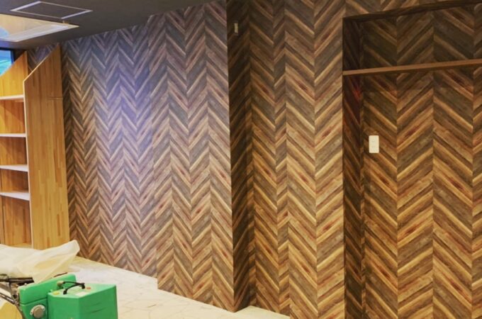 某イタリアンレストランの内装工事での写真。こちらが工事前の前店舗で使用されていた壁。こちらの石タイルや布で隠されている部分を新オー...